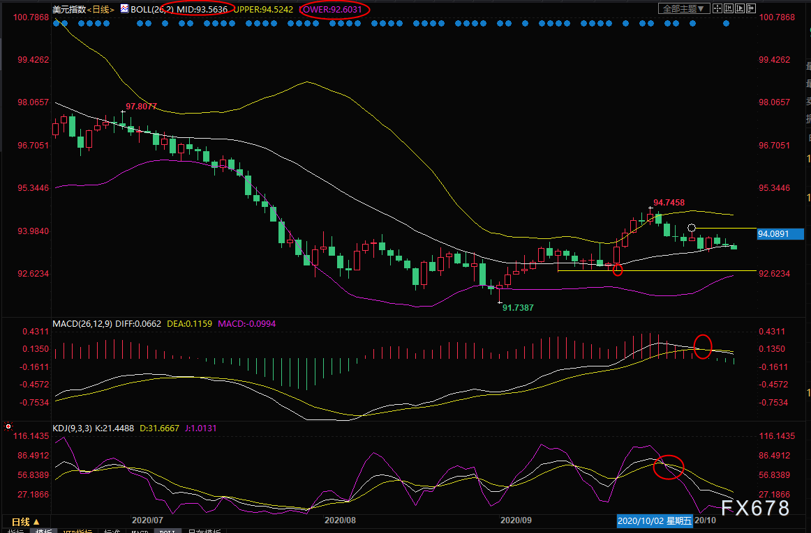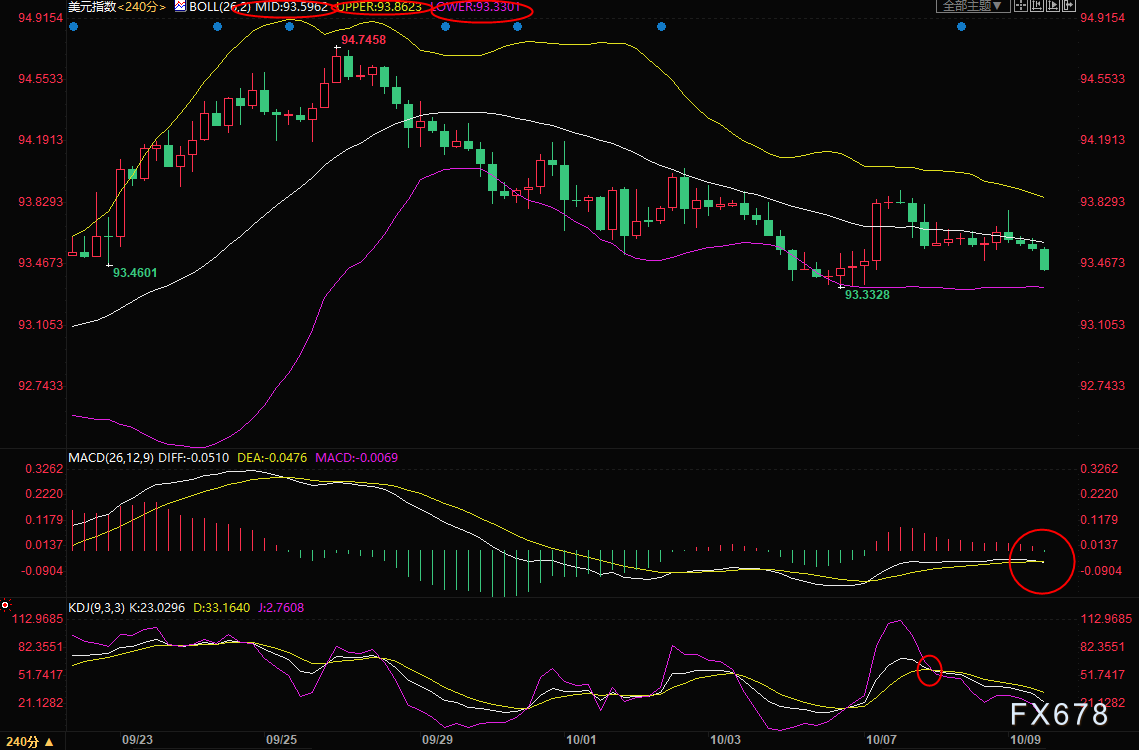 若汇价坚守55日均线,并回升至布林线中轨上方,则削弱短线看空信号,进一步阻力在10日均线93.75附近,强阻力参考10月2日高点94.03位置。