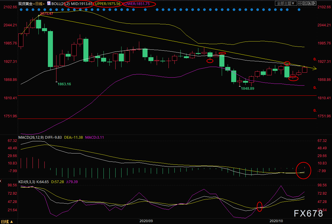 若不能顶破布林线上轨附近阻力,则金价仍可能维持震荡走势,一旦回落至布林线中轨1897.76下方,则增加短线看空信号。