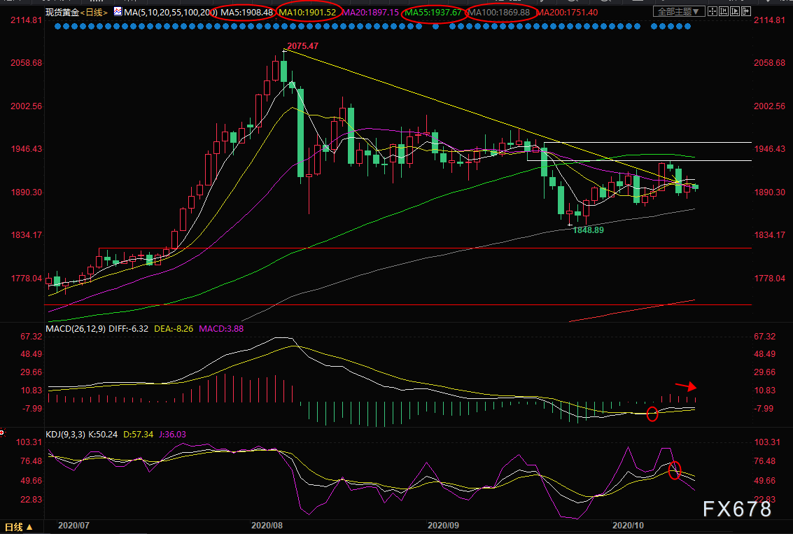 MACD有死叉趋势,KDJ死叉运行,上一交易日金价反弹力度不大,目前金价仍受到10日均线和1900关口压制,短线金价仍面临进一步下行风险;下方初步支撑在本周低点1882.54附近;重点关注100日均线1869.86附近支撑,若跌幅该支撑,则增加金价后市的大跌风险。