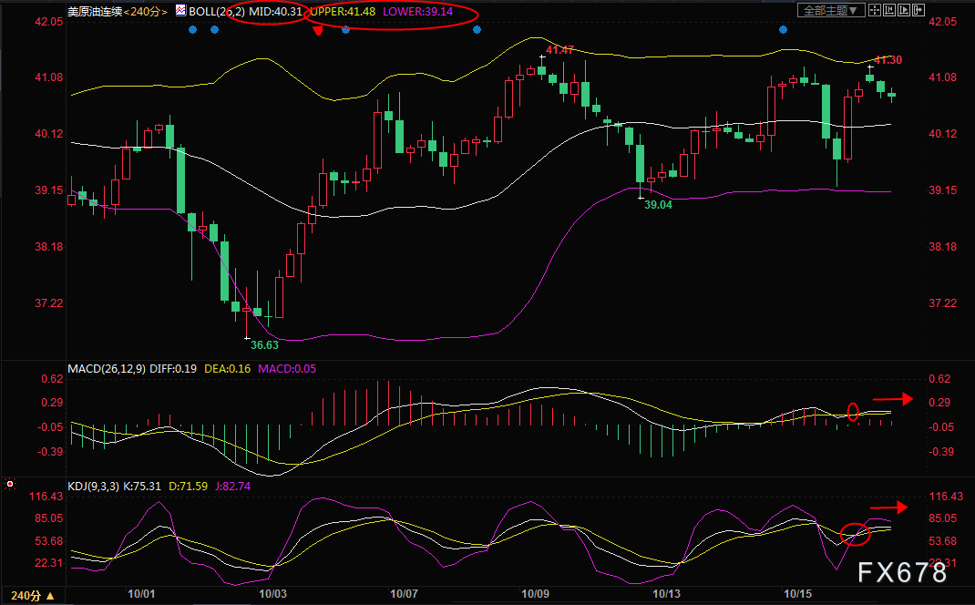 若油价强势顶破布林线上轨41.49附近阻力,则有望打开上涨通道,进一步目标可以参考8月份高点43.78附近阻力。