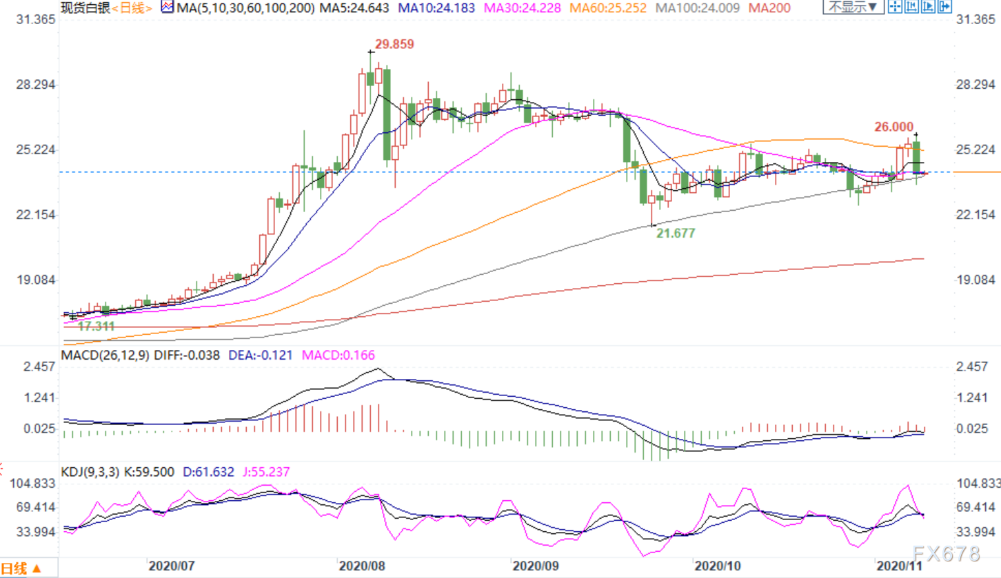 解析:现货白银隔夜暴跌近2美元,但因是宏观上疫苗消息驱动,跌势不及黄金,随着拜登胜选,全球经济复苏,白银工业需求有助于其更加强劲。