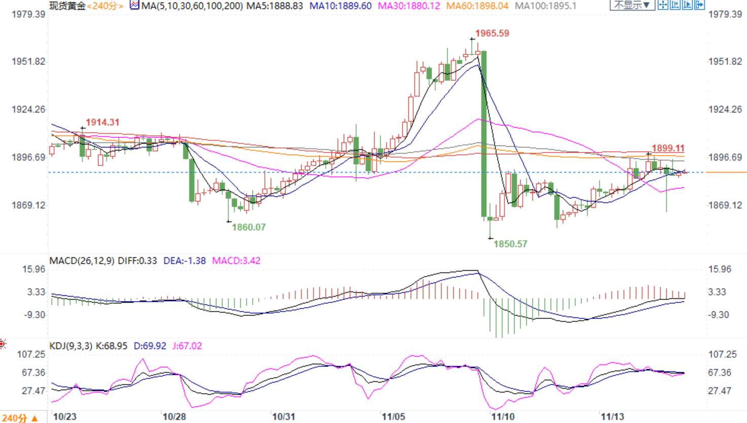 4小时级别:震荡上行;MACD金叉,KDJ金叉尚未形成,上行势头偏弱,短线震荡格局,新建空单可背靠1900大关,预计将在1860-1900区间交易,多空头思维需转为区间交易。