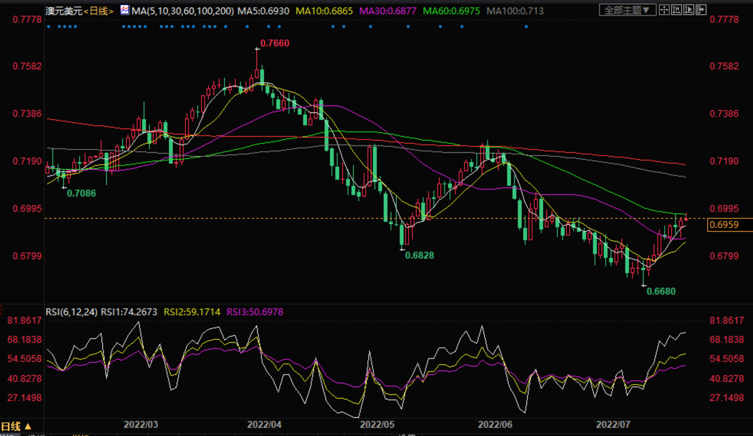 技术分析,尽管最近出现上涨,但澳元兑美元仍处于0.6955 - 0.6975的短期交易区间内,该区间包括4月初以来的下行阻力线和50日移动均线。