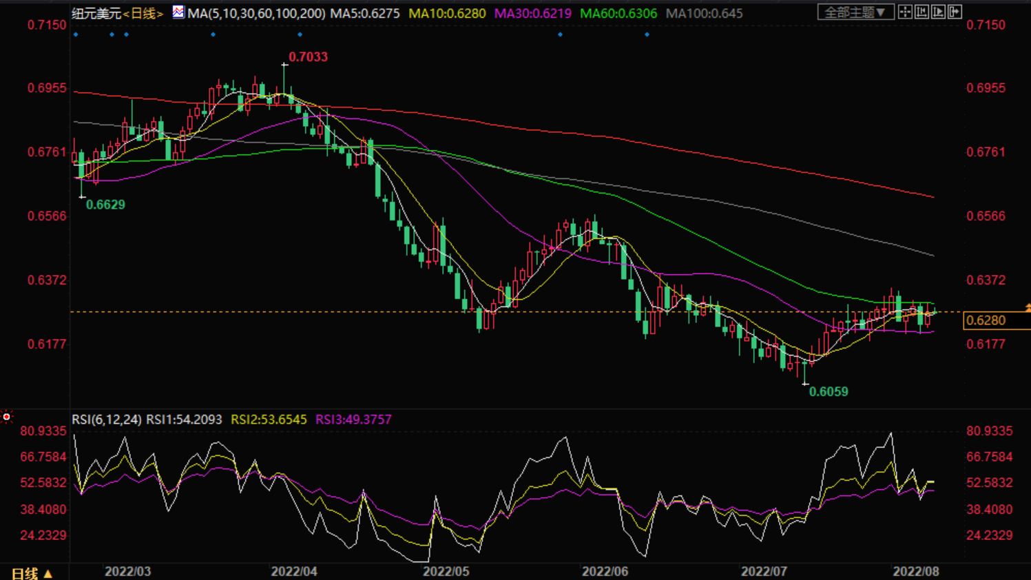 技术分析,尽管20日移动均线在0.6240附近为纽元兑美元短期下行设置了底部,但从6月16日开始的向下倾斜阻力线在0.6335-40附近对该货币对买家构成挑战。