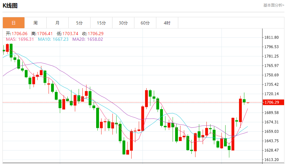 周三(11月9日),现货黄金从逾四周高位回落,下逼1700美元关口,收跌0.35%,报1706.62美元/盎司;现货白银收跌1.39%,报21.05美元/盎司。