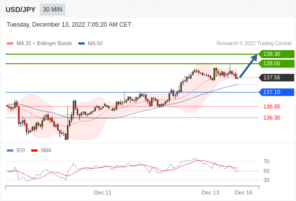 在 137.10 之上,看涨,目标价位为 138.00 ,然后为 138.30 。