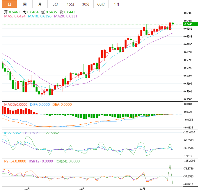技术分析,超买相对强弱指数(14)未能提供突破关键障碍0.6480的日收盘价,该障碍包括8月和12月迄今为止所见的顶部,对纽元兑美元买家构成挑战。
