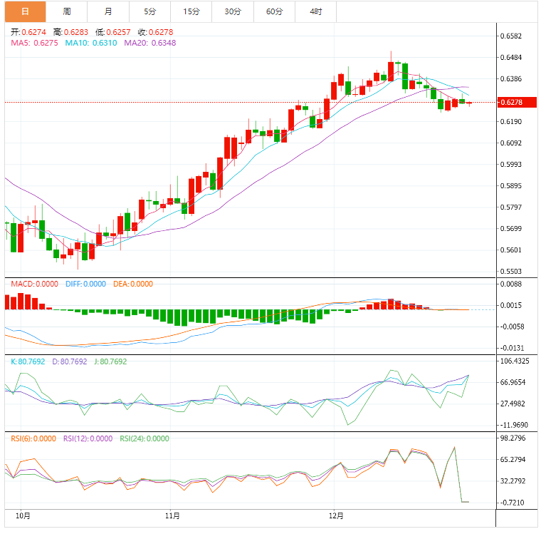 同样作为短期关键支撑位的是0.6230附近的月度低点,随后是11月下旬在0.6290附近的波动低位。