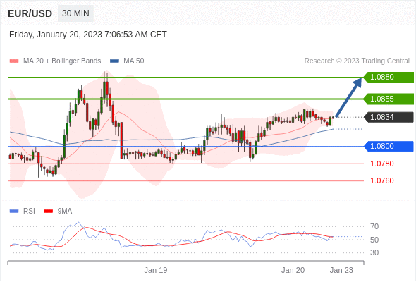 周五(1月20日)亚盘,欧元/美元高位回落,暂报1.0844,涨幅0.16%。欧洲央行行长拉加德周四表示,通胀率远远过高,欧洲央行将继续提高利率。