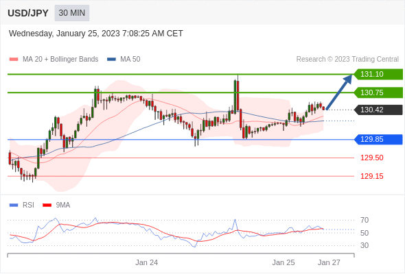 29.85上方的多头头寸,目标在130.75和131.10。另一种情况:低于129.85,寻找进一步的下行空间,目标为129.50和129.15。