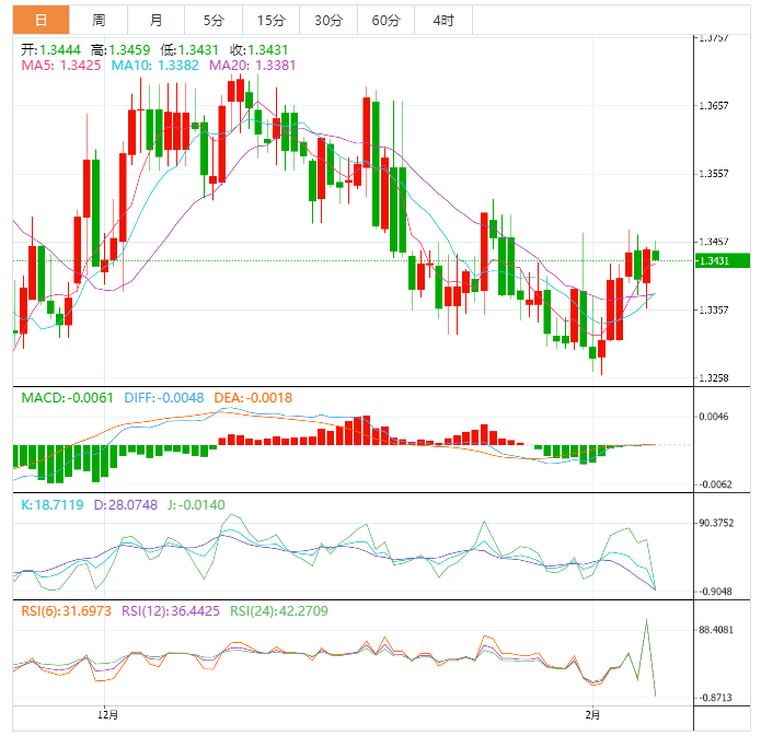 20期指数移动平均线(EMA)位于1.3423,是美元多头的主要支撑。