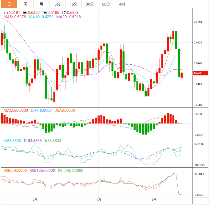 纽元兑美元出现了垂直下跌,并在小时尺度上大幅下滑至61.8%的斐波那契回撤位(从4月26日的低点0.6117至5月11日的高点0.6385)0.6216下方。10期指数移动平均线(EMA)位于0.6200,这对新西兰元多头来说是一个障碍。