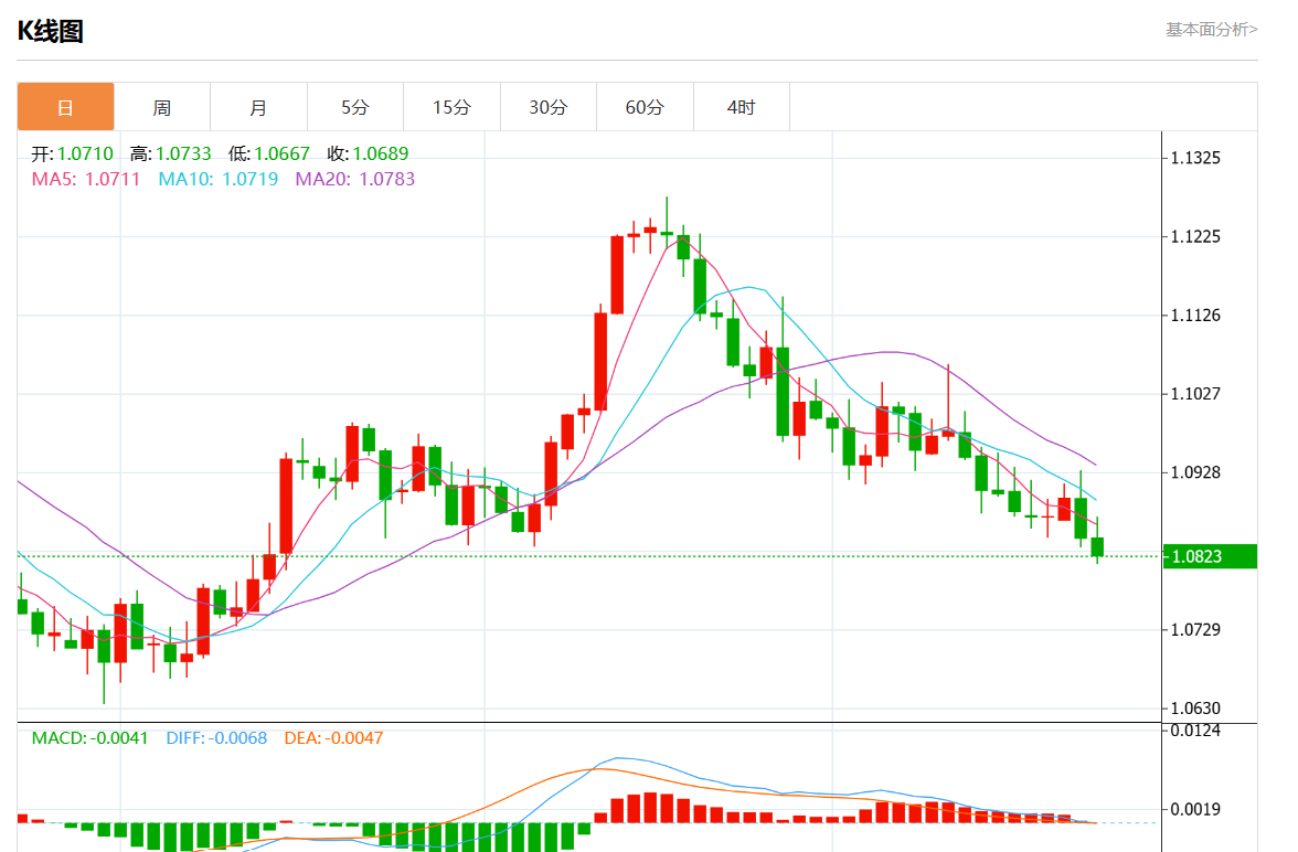 周三欧市盘中,欧元/美元最新报1.0829,日图跌0.15%