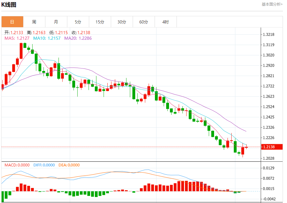 汇价高见1.2163,低见1.2115。上一交易日,汇价收于1.2133。