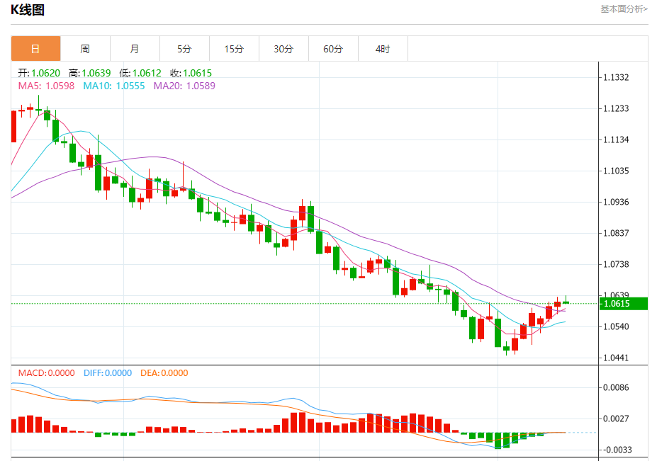 汇价高见1.0639,低见1.0612。上一交易日,汇价收于1.0619。