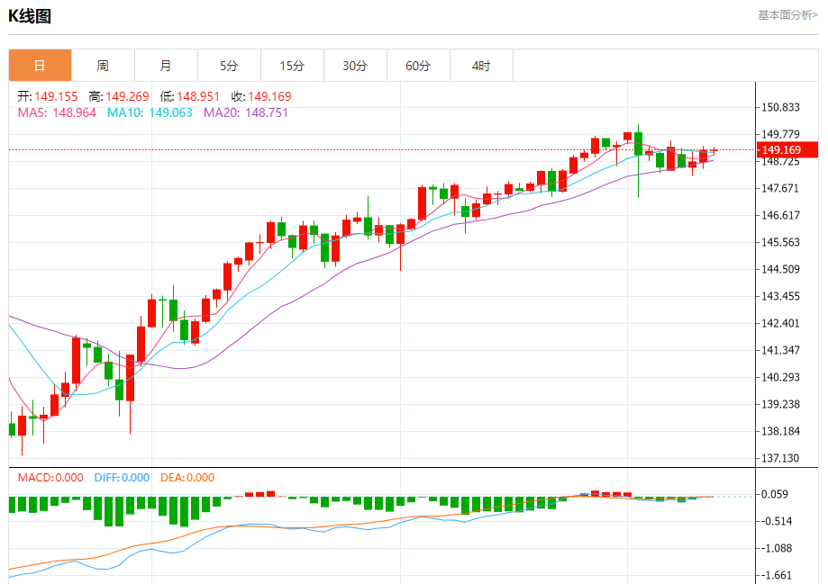 汇价高见149.269,低见148.951。上一交易日,汇价收于149.158。