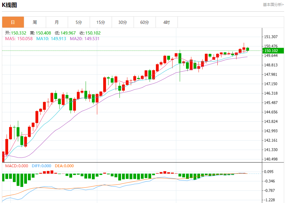 汇价高见150.408,低见149.967。上一交易日,汇价收于150.360。