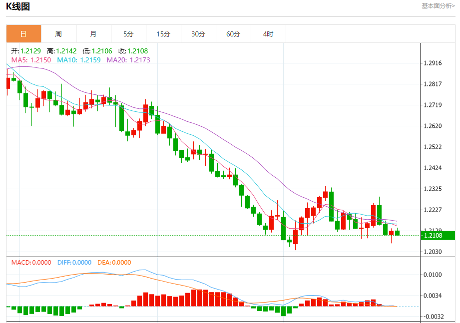 汇价高见1.2142,低见1.2106。上一交易日,汇价收于1.2127。