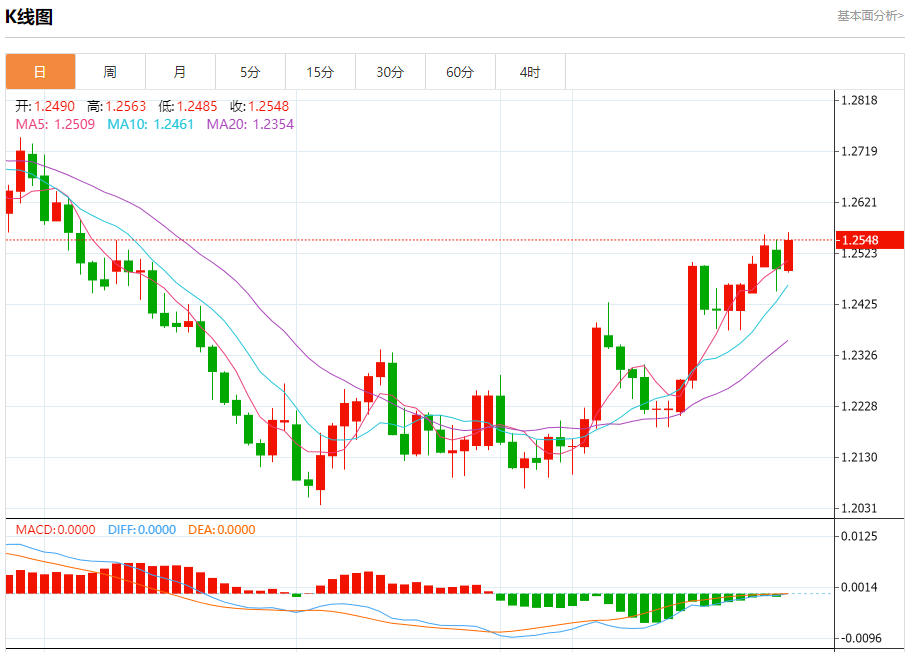 汇价高见1.2563,低见1.2485。上一交易日,汇价收于1.2493。