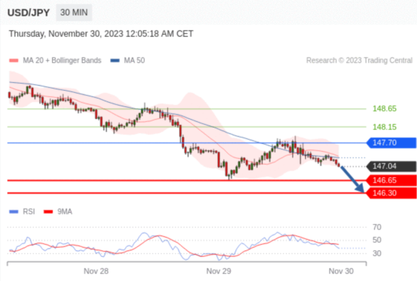 在 147.70 之下,看跌,目标价位为 146.65 ,然后为 146.30 。