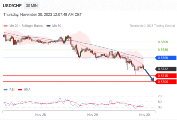 在 0.8760 之下,看跌,目标价位为 0.8715 ,然后为 0.8700 。