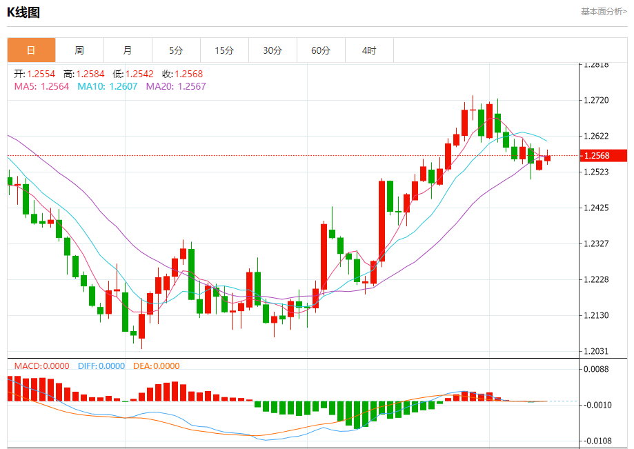 汇价高见1.2584,低见1.2542。上一交易日,汇价收于1.2554。
