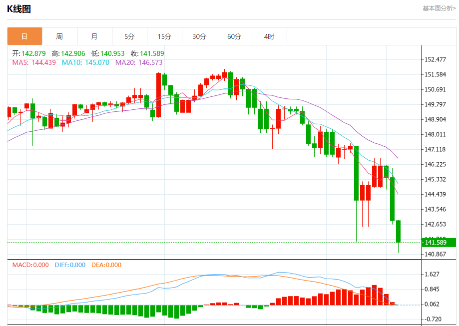 汇价高见142.906,低见140.953。上一交易日,汇价收于142.874。