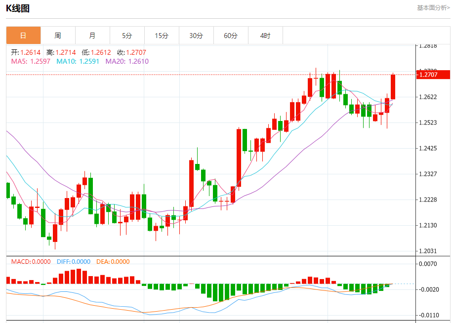 汇价高见1.2714,低见1.2612。上一交易日,汇价收于1.2617。