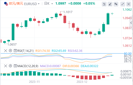 欧洲央行周四维持利率不变,但没有提及2024年降息的任何事情,这与前一天美联储的鸽派论调相反。欧洲央行预计通胀将再次反弹,物价压力将保持不变。在欧洲央行会议之后,FOMC决议后的欧元反弹和美元指数下跌态势保持完好。