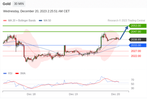 在 2033.00 之上,看涨,目标价位为 2047.00 ,然后为 2053.00 。