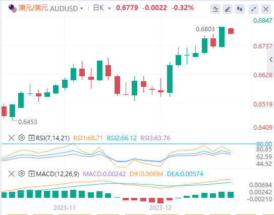 澳元/美元一度测试0.6803,然后出现回落。如果阻力保持坚固,那么澳元/美元看上去可能在下周末前跌至0.6750-0.67。