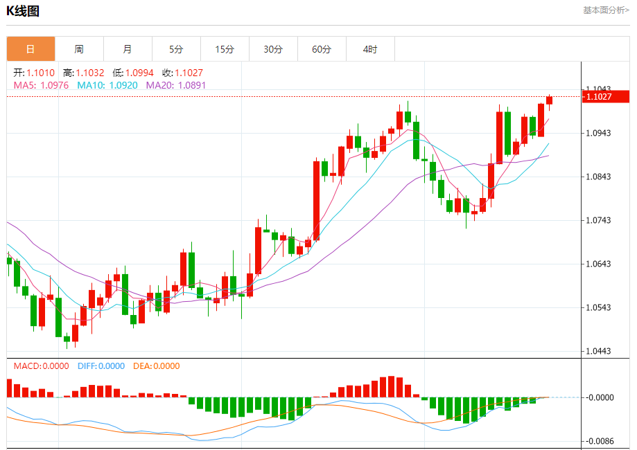 汇价高见1.1032,低见1.0994。上一交易日,汇价收于1.1010。