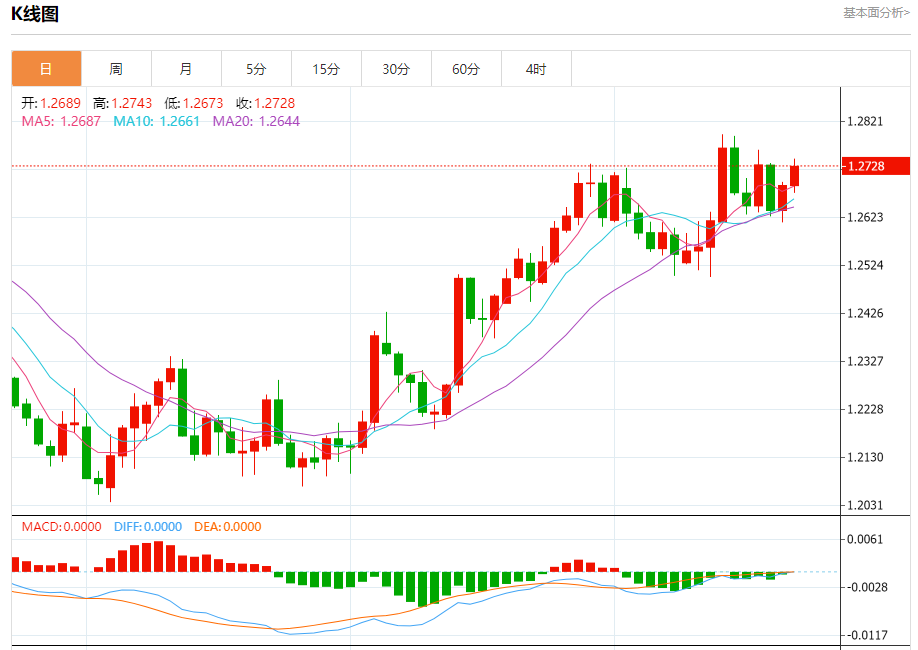 汇价高见1.2743,低见1.2673。上一交易日,汇价收于1.2689。