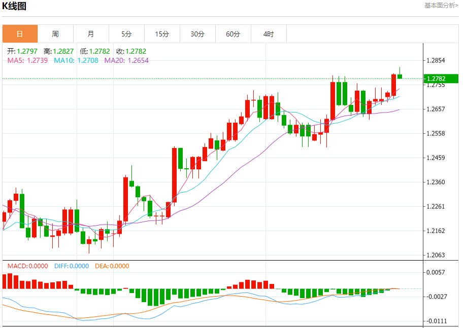 汇价高见1.2827,低见1.2787。上一交易日,汇价收于1.2797。