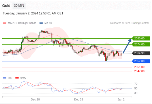 在 2057.00 之上,看涨,目标价位为 2074.00 ,然后为 2080.00 。