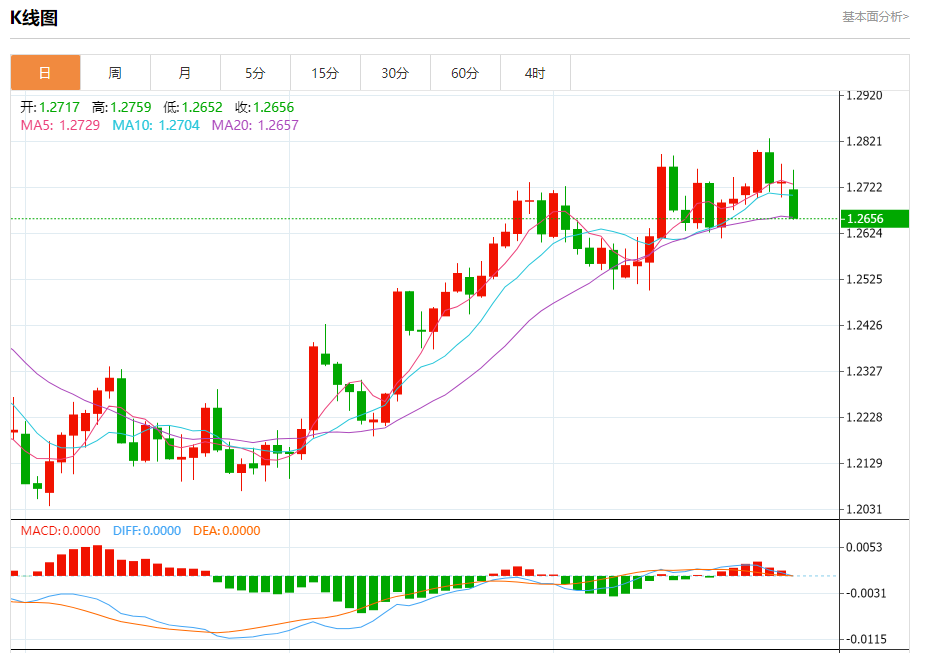 汇价高见1.2759,低见1.2652。上一交易日,汇价收于1.2733。