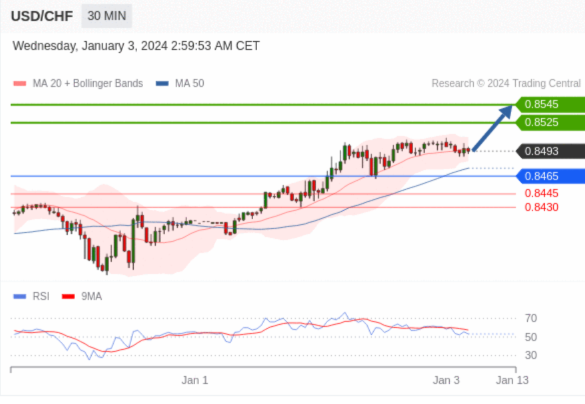 在 0.8465 之上,看涨,目标价位为 0.8525 ,然后为 0.8545 。