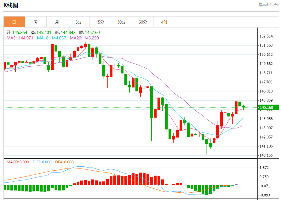 汇价高见145.401,低见144.838。上一交易日,汇价收于145.257。