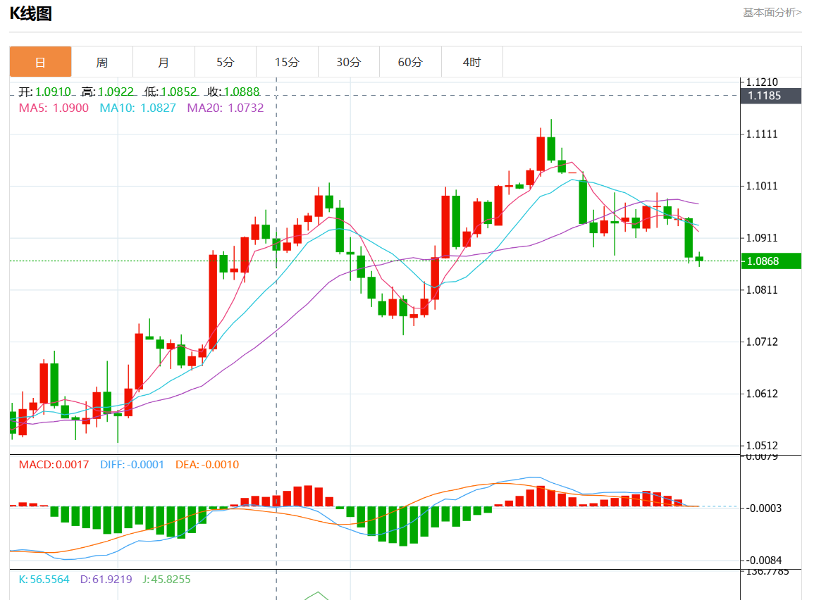 周三欧市盘中,欧元/美元最新报1.0857,日图跌0.13%.