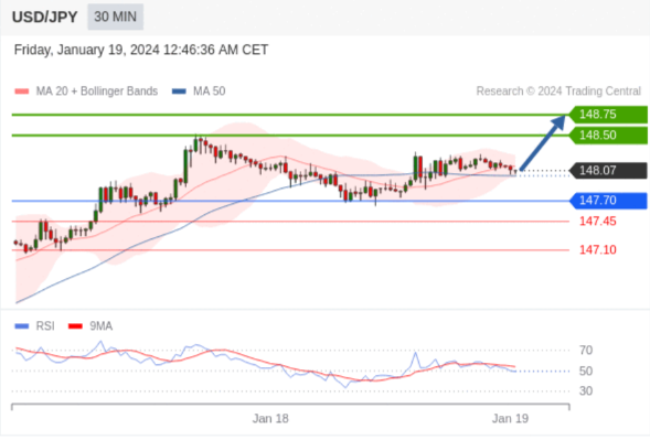 在 147.70 之上,看涨,目标价位为 148.50 ,然后为 148.75 。