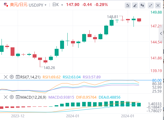 美元/日元在过去5个交易日中一直在148.80下方波动,近期将在149-146区间内横盘震荡。短期内,美元/日元可能在更窄的区间149-148之间交易。