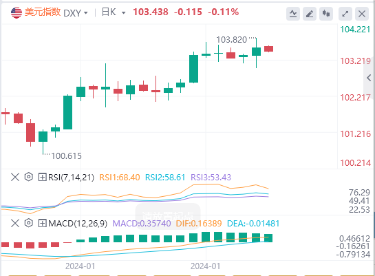 周二,因投资者预期,考虑到美国经济依然稳定,美联储不会仓促降息,美元指数一度升至103.82,为去年12月13日以来最高。