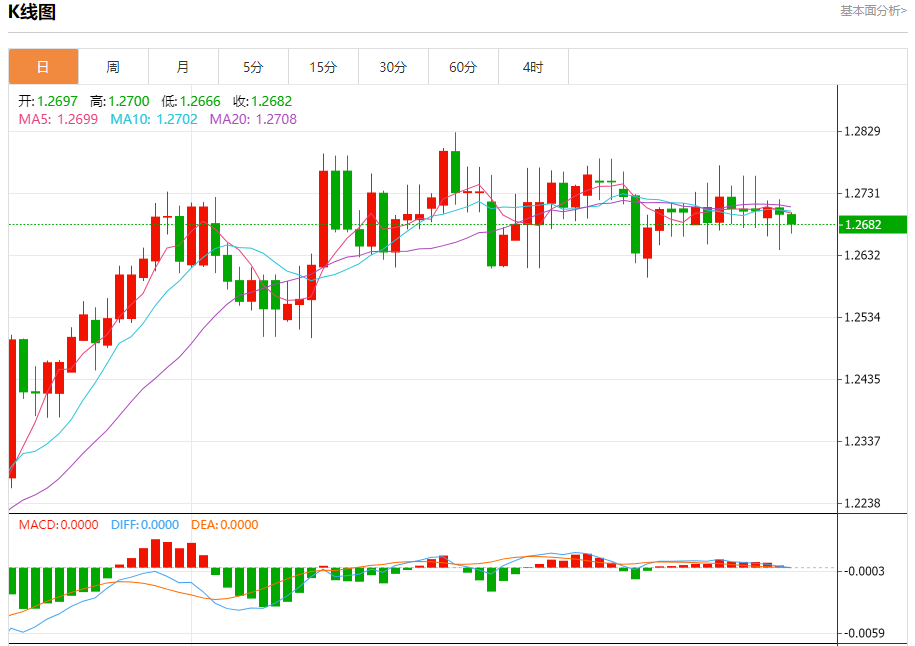 汇价高见1.2700,低见1.2666。上一交易日,汇价收于1.2697。