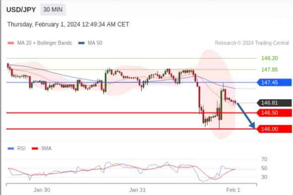 在 147.45 之下,看跌,目标价位为 146.50 ,然后为 146.00 。