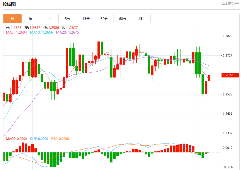 汇价高见1.2638,低见1.2586。上一交易日,汇价收于1.2598。
