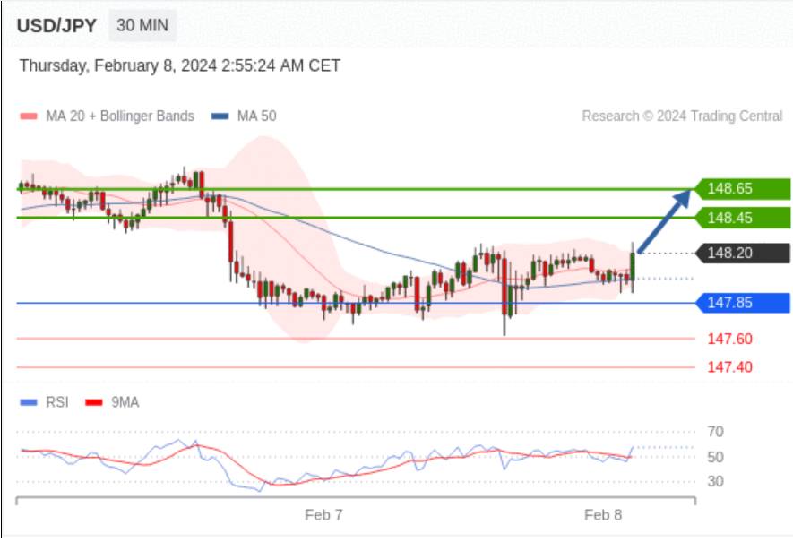 在 147.85 之上,看涨,目标价位为 148.45 ,然后为 148.65 。