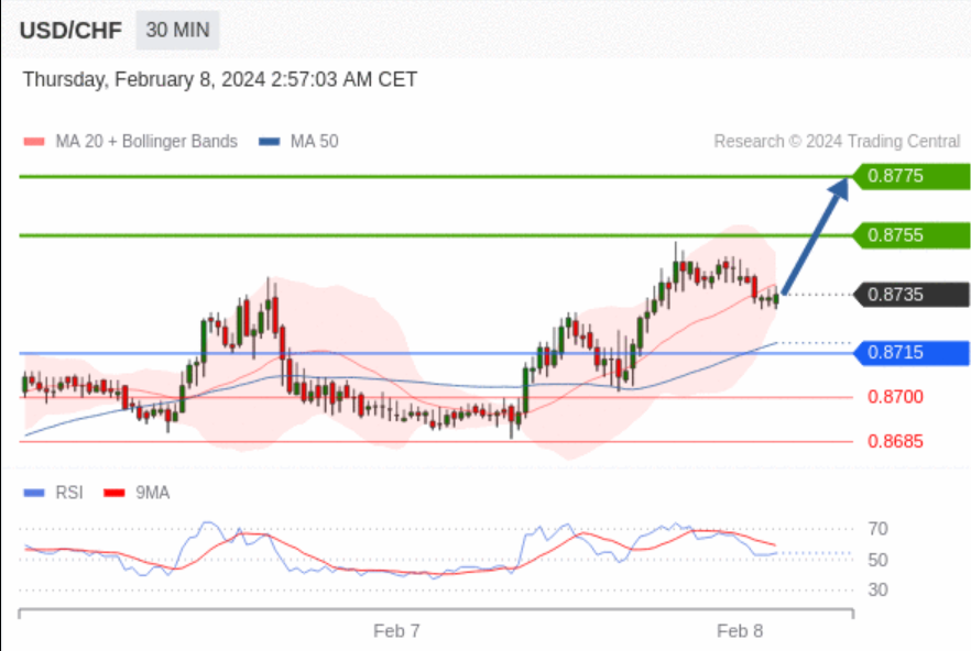 在 0.8715 之上,看涨,目标价位为 0.8755 ,然后为 0.8775 。