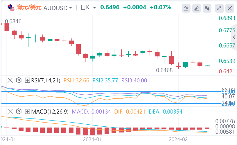 澳元/美元表现疲软,在尝试清除0.6525/0.6535上方阻力位失败后,价格小幅走低。如果日线收盘价为负,看跌拒绝得到确认,可能很快就会看到回调至0.6470,甚至可能是 0.6395。