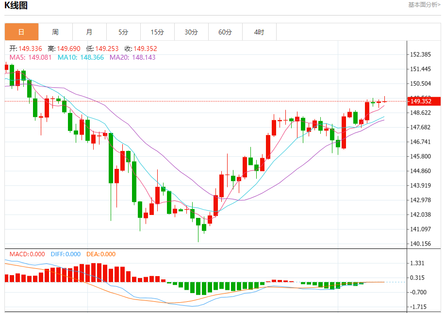 汇价高见149.690,低见149.253。上一交易日,汇价收于149.328。
