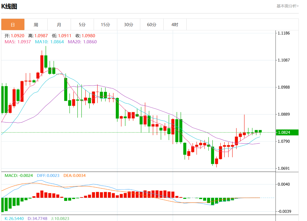 周一欧市盘中,欧元/美元最新报1.0824,日图涨0.02%.